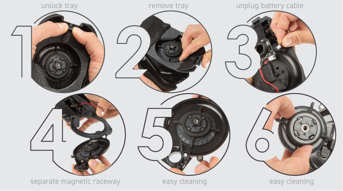 To take apart your CTRL2, remove the top shell, then use both thumbs to unlock the tray as shown in step 1, remove the tray and unplug the battery cable from the board, then as shown in step 4, simply pull down on the raceway to separate the dual magnet locks and you can now quickly clean out the inside of your CTRL2. For a more thorough cleaning, occasionally remove the drive hub as shown in step 6.